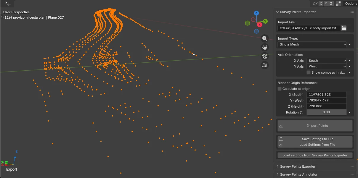 This add-on provides tools for importing real-world survey and control point data into Blender. It reads common text-based formats like CSV and TXT, allowing you to map X, Y, and Z columns and handle various delimiters, decimal formats, and encodings.