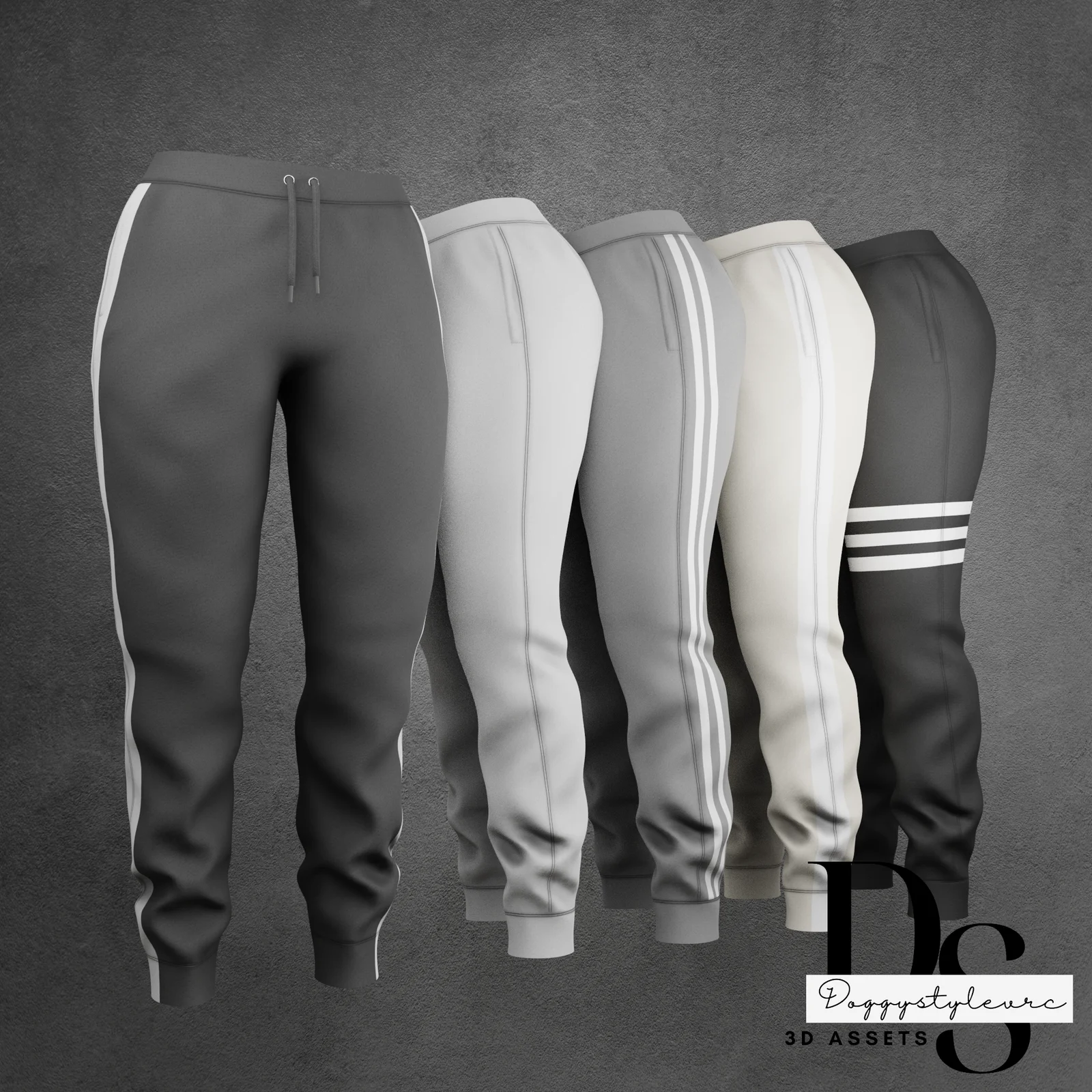 A 3D model of sweatpants, provided in FBX format. The mesh consists of 10,712 triangles and features clean topology. It is rigged and weight-painted to fit the Zinpias RP Female base, including rigged waistband strings. The model includes 4K textures with seven base colors, three stripe styles, and normal, metallic, and roughness maps. Ambient occlusion is baked directly into the base textures.