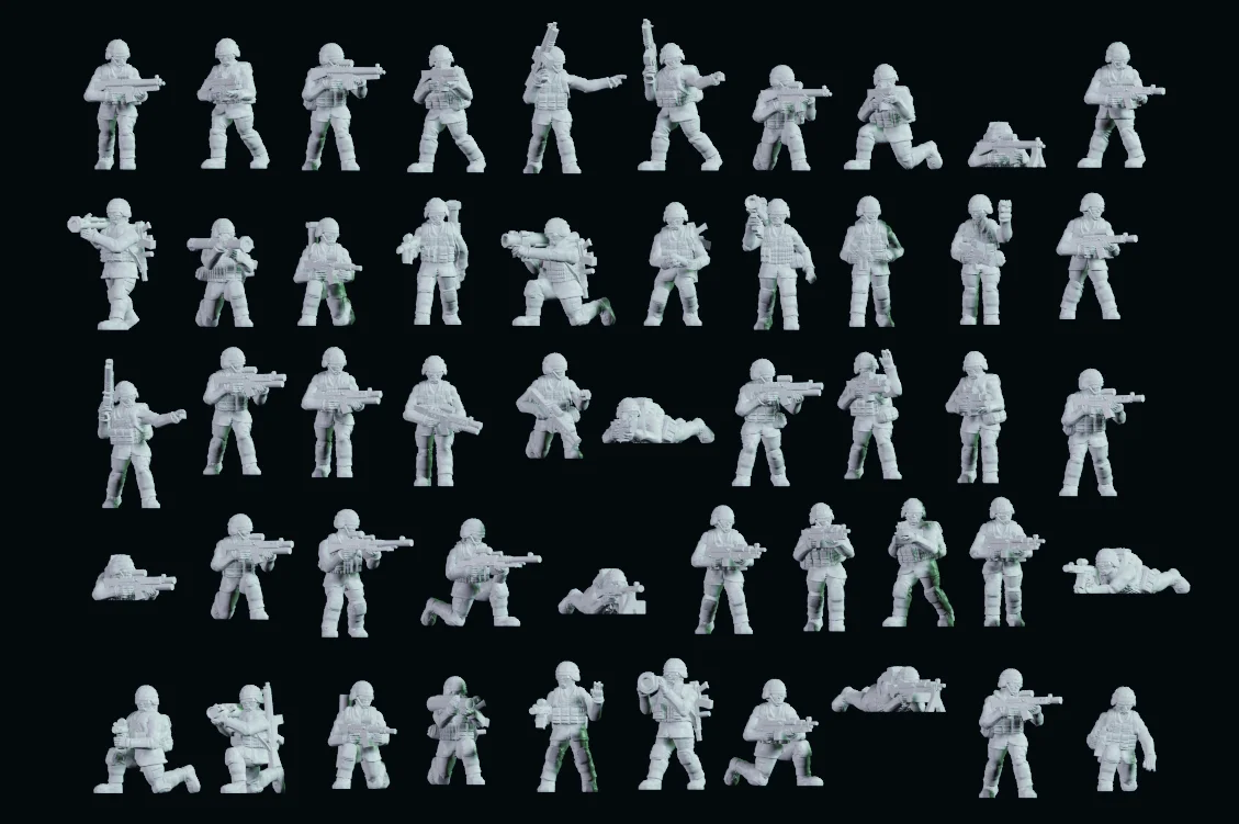 This collection includes 50 Swedish infantry miniature models scaled to 1/100 (15mm scale, where a standard human figure measures 18mm). The set features both male and female figures armed with a variety of specific military weapons, including AK4 and AK5 rifles, KSP 58 GPMGs, KSP 90 LMGs, Carl Gustav M4s, AT4s, NLAWs, and P-Scott M68s. The assets are provided in both pre-supported and unsupported formats to accommodate different 3D printing workflows, including FDM setups. While the models can be scaled up, scaling below 50% is not recommended due to the thickness of certain details.