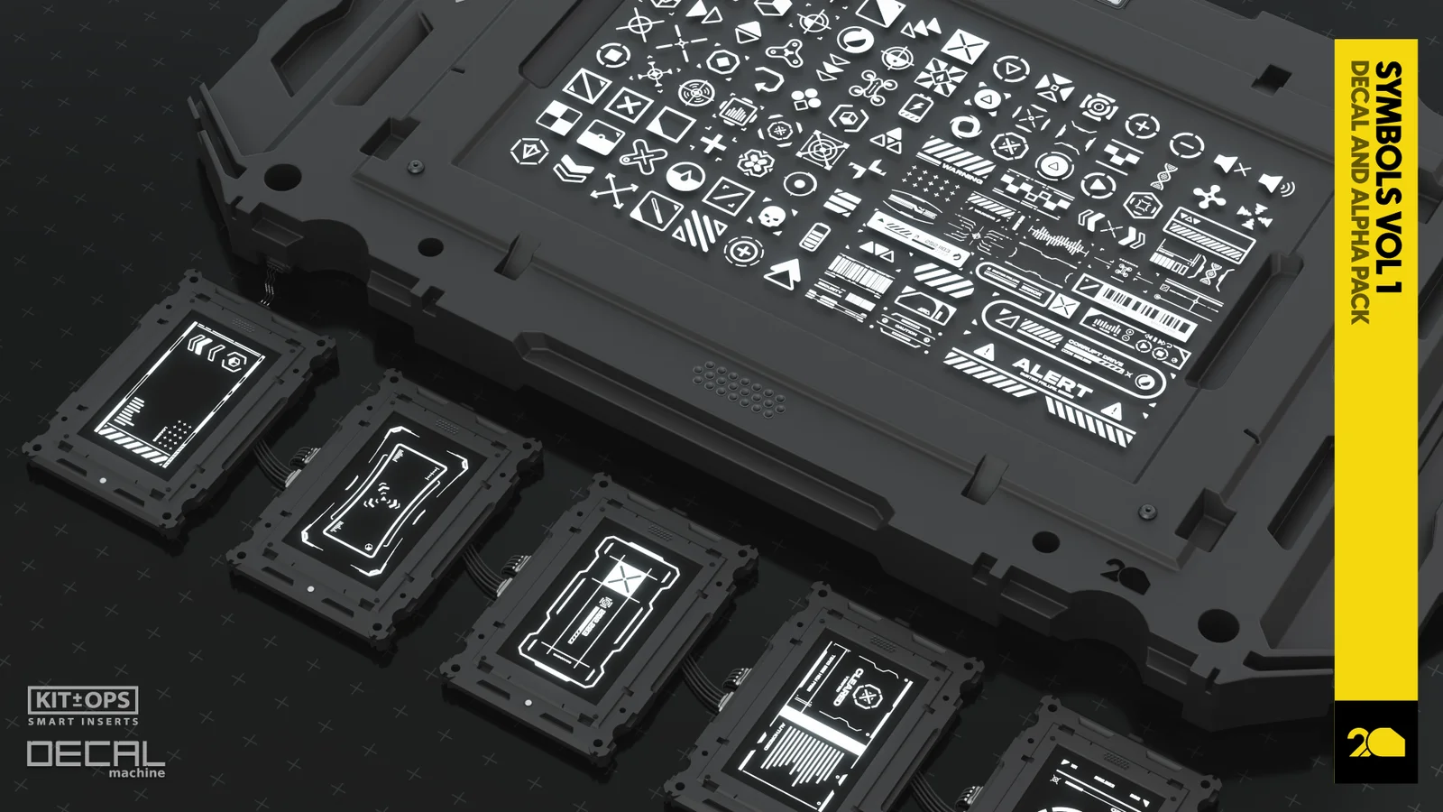 A collection of 100 unique symbol and information decals, along with five bonus HUD-style designs. The assets are provided as high-resolution 2K and larger PNG alpha masks, suitable for adding surface details to 3D models. The pack includes pre-configured files that are ready to be used directly with the DECALmachine and KIT OPS add-ons in Blender.