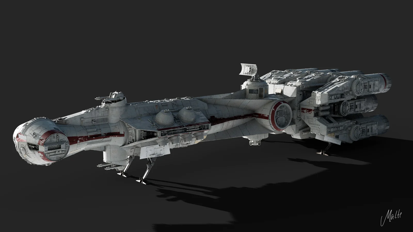 A detailed 3D model of the Tantive IV Blockade Runner. The model is built with an all-quad topology and features triple-edged detailing for production workflows. It utilizes UDIM texturing across approximately 80 tiles.