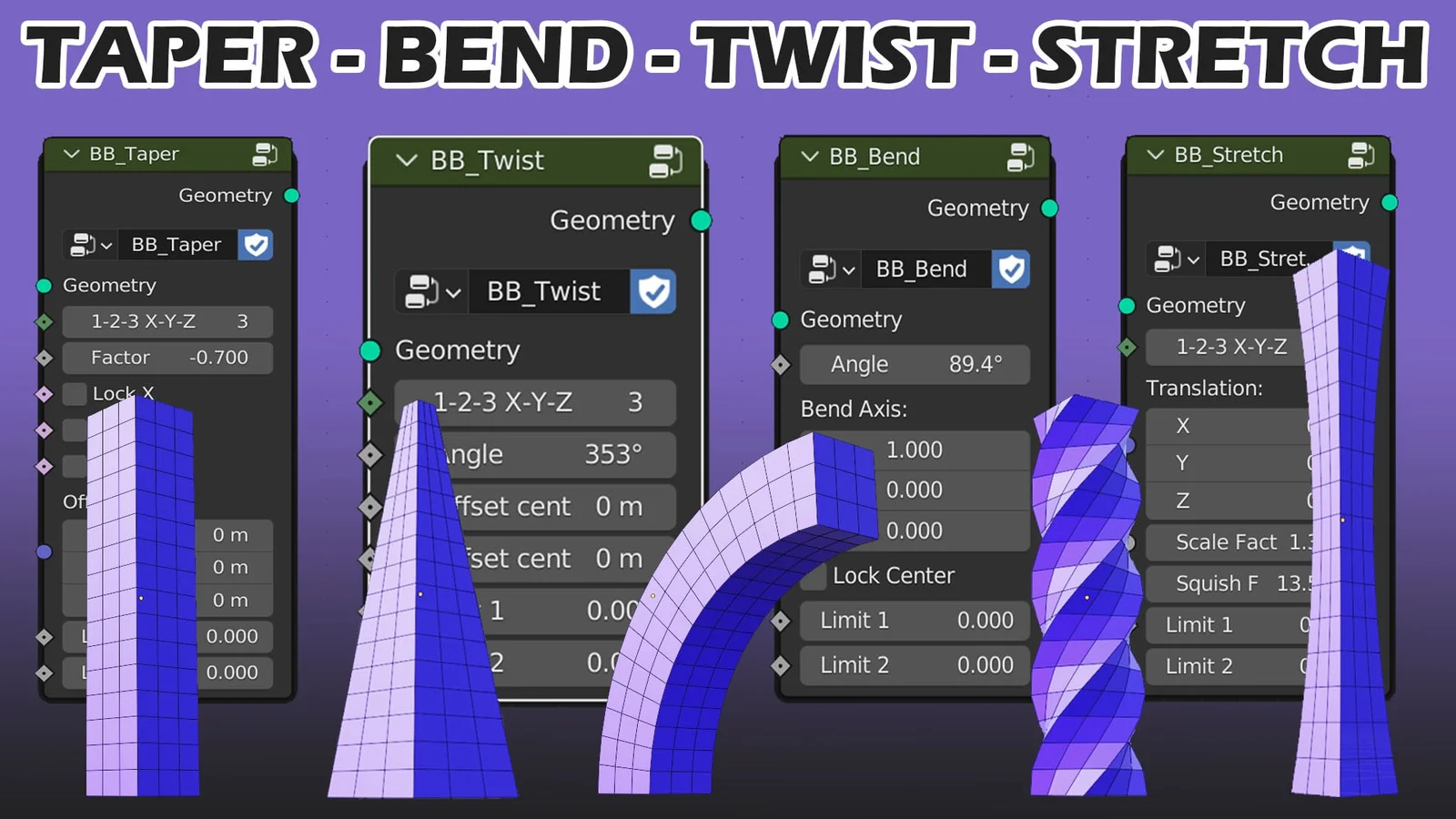 This product provides a collection of four Geometry Node groups designed to replicate the functionality of Blender's Simple Deform modifier. The included nodes allow users to apply taper, bend, twist, and stretch deformations directly within procedural node-based workflows. The bend node includes specific controls for axis rotation behavior and a toggle to rotate the reference plane by 90 degrees.