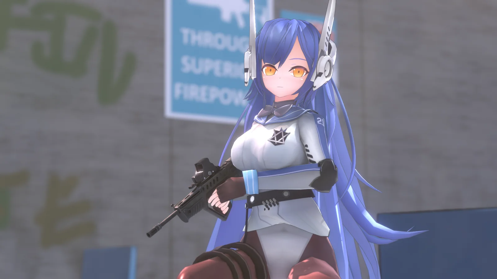 A fan-made, rigged 3D character model of TAR-21 from Girls' Frontline, optimized for Blender. The model consists of 25,000 vertices and 49,000 triangles, utilizing an outline solidify modifier to achieve a stylized, anime-inspired look. It features a comprehensive rig that includes IK/FK switches for the limbs and spine, along with isolated rotation toggles for the head and limbs. Facial expressions are managed through bone-driven shape keys, providing controls for blinks, mouth poses, blush, and eye sparkles. Additionally, the rig includes specific bones in the hair and chest designed to integrate with the third-party Wiggle Bone add-on.