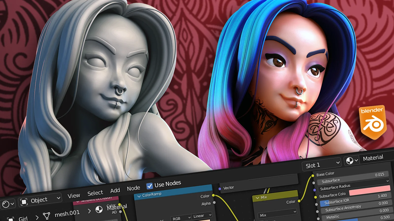 A 3D bust model of a tattooed girl, originally created to demonstrate stylized skin and hair material creation. The package includes two Blender project files: one containing the base model without materials, and another featuring the fully textured setup. The stencil image files used to create the character's tattoos are also included.