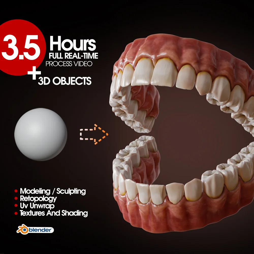 This product provides a complete 3.5-hour real-time process video demonstrating the creation of teeth and gums in Blender. The footage is provided without audio commentary, serving as a continuous visual reference of the workflow. The package also includes the resulting 3D models provided in .blend, .fbx, and .obj formats.
