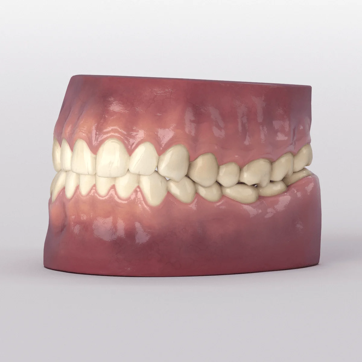 A low-polygon, triangulated 3D model of human teeth and gums. The mesh is merged without individual roots or UDIM layouts, making it suitable for final production use rather than extensive topological editing.