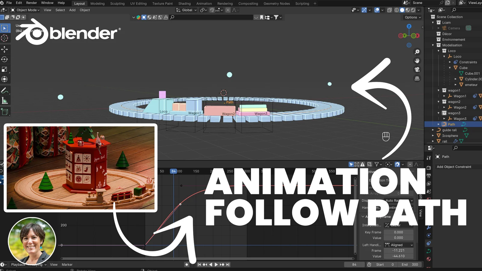 This project file serves as a companion to a tutorial demonstrating how to animate a train in Blender. The setup illustrates the process of rigging and animating a locomotive with connected wagons utilizing the follow path constraint. Additionally, the scene features a low-poly smoke effect generated by a particle emitter and includes a rail system constructed from a curve object.