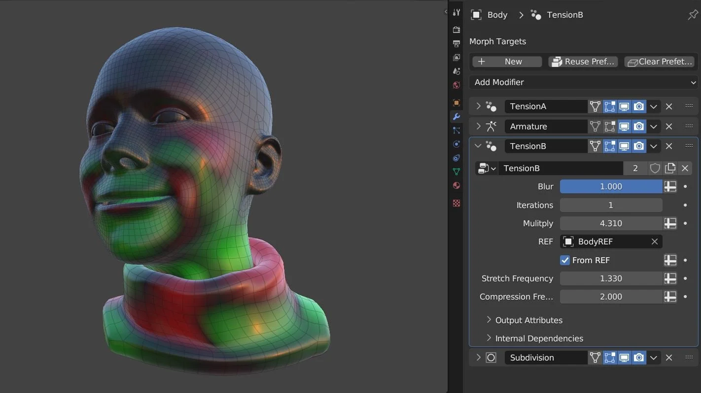 Tension Weights is a Geometry Nodes setup that calculates mesh compression and stretch resulting from deformations. The system requires placing one node group before deformation modifiers, such as armatures, and a second node group afterward. The resulting data can be output as vertex colors or vertex groups to drive material effects such as dynamic wrinkles or normal mapping. The setup includes support for a base reference object required for shapekey calculations and utilizes a vertex color mask to restrict wrinkles in convex areas.
