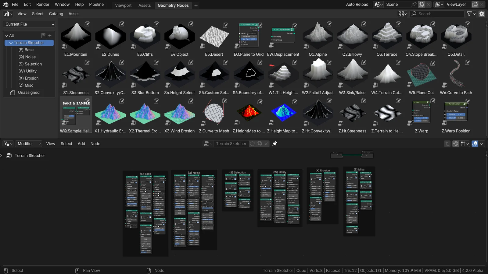 Terrain Sketcher provides a set of Geometry Node groups designed for creating terrain blockouts directly within Blender. The node setup allows users to sketch and establish procedural terrain layouts during the early stages of environment design. The package includes a demonstration file to help users understand the node configurations and workflow.