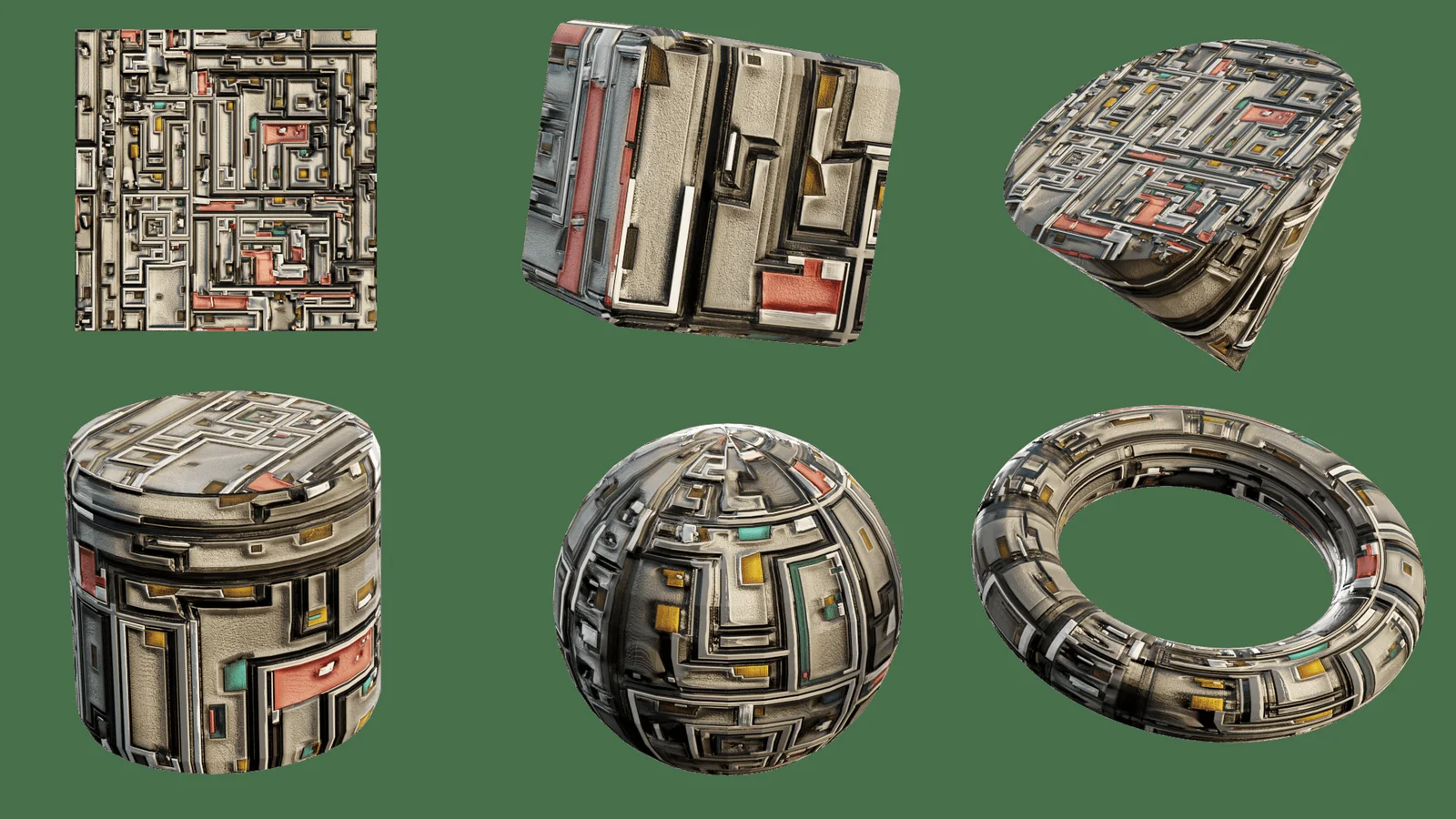 This collection includes nine to ten tileable texture sets created by rendering 3D scenes in Blender and processing them through Materialize. The resulting texture sets are designed to be seamless and can be customized within material node trees, such as by using a Color Ramp to adjust their appearance.