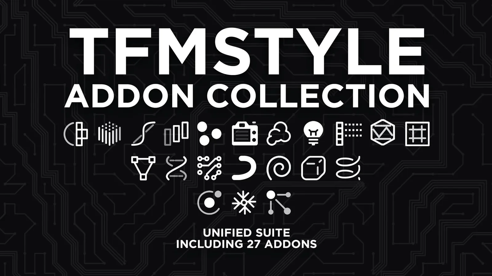 The TFMSTYLE Addon Collection is a unified suite of creative tools for Blender, combining 20 procedural generators and seven utility add-ons within a modular framework. The system includes shared features like detachable tabs, an auto-updater, live parameter updates, and context-aware editing. The utility add-ons provide workflow enhancements such as viewport display toggles, camera and render preset management, visual grid guides, automated viewport orbiting, bounding-box object rescaling, and mesh voxelization. The procedural generators offer parametric creation tools for a wide variety of subjects, including PCB circuit patterns, cityscapes, volumetric-style clouds, crystal clusters, DNA helices, fences, grids, and mathematical knots.