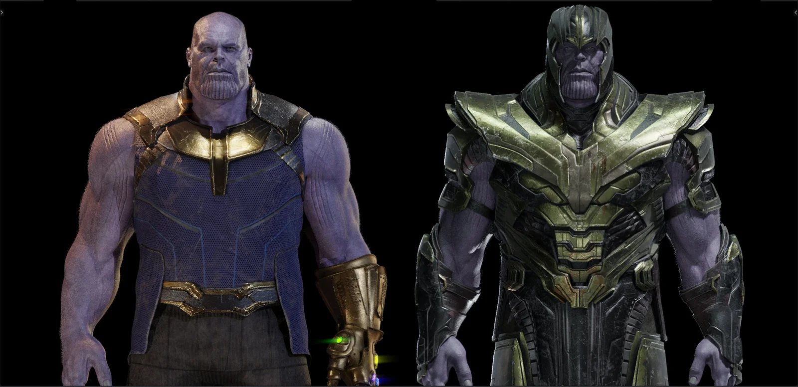 A rigged 3D character model of Thanos from Avengers: Infinity War, provided as a native Blender file. The model is fully textured and includes both his standard Infinity War suit and full armor variants. It comes equipped with custom sliders to control the visibility of suit parts and variations, alongside five facial pose assets and four body pose assets to assist with posing and animation.