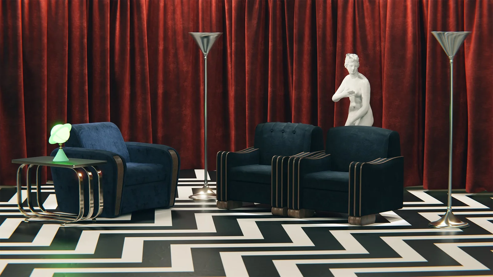 A complete 3D scene reconstruction of The Black Lodge set from Twin Peaks. This project includes the Blender scene file along with all associated textures and models required to recreate the environment.
