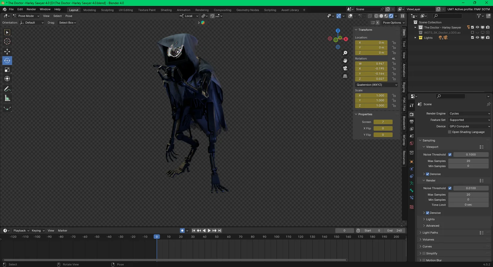 This is a rigged 3D character model of The Doctor (Harley Sawyer) extracted from the game Poppy Playtime Chapters 4 and 5. The rig includes specific controls for the character's face. Using custom properties located on the head bone, users can cycle through various screen textures, including updated designs from Chapter 5. Additional properties allow the screen texture to be flipped along the X and Y axes to expand the available expressions.
