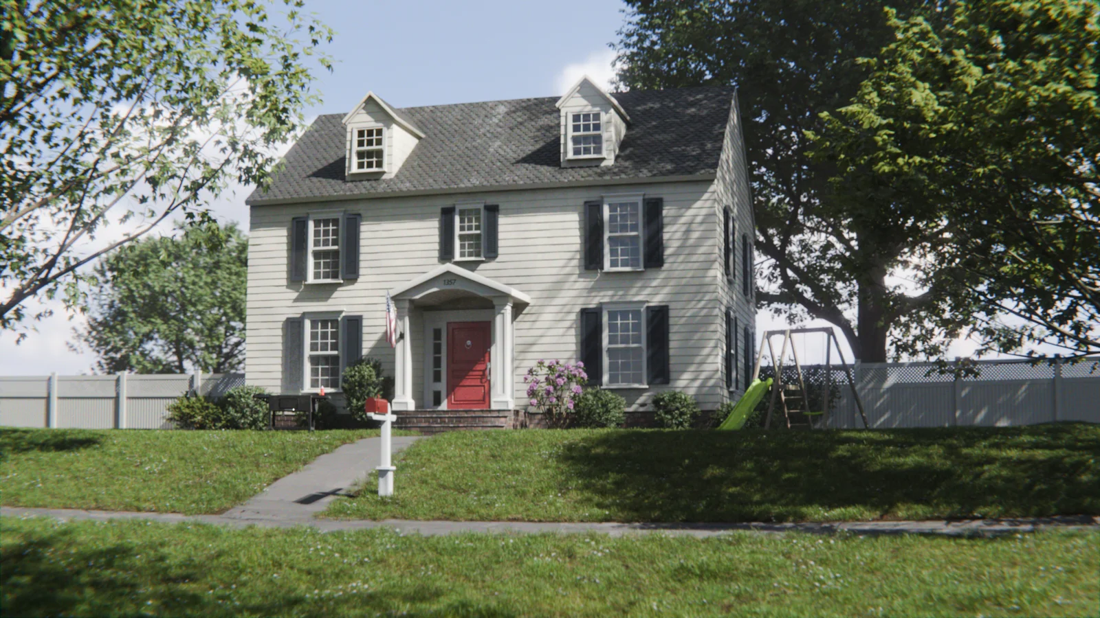 The first module covers the creation from scratch of a colonial American-style house, detailing the modeling of wooden siding, windows, doors, and a portico. It also explores landscaping techniques for building yards and gardens, alongside modeling backyard props like a swing set and a barbecue grill. This section incorporates simulation workflows, including cloth simulation for a flag, smoke simulation for the grill, and heat distortion effects.