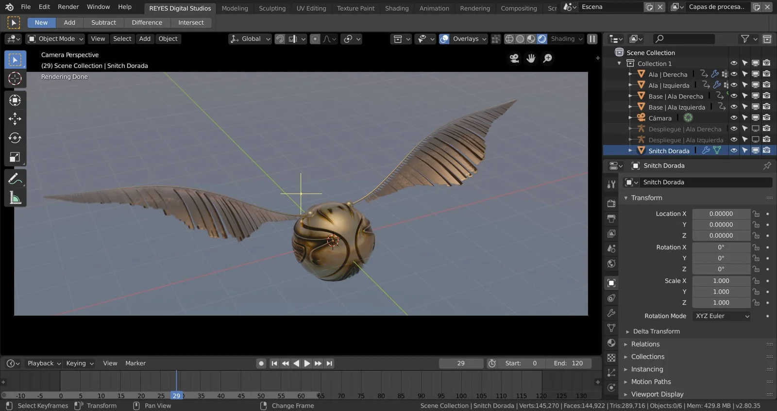 A photorealistic 3D model of the Golden Snitch, inspired by its appearance in the first Harry Potter film. The model comes fully textured and is compatible with both the Cycles and EEVEE render engines. The included .blend file features pre-made wing unfolding and flapping animations. The asset is ready to be placed into a scene, requiring only position animation and lighting setup to be render-ready.