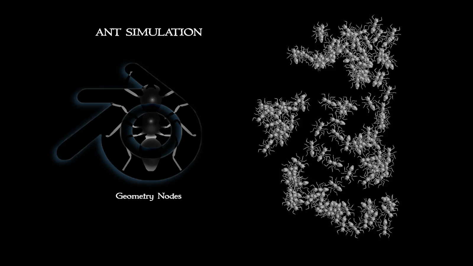 The Hive Ant Simulation is a self-contained boid system built using Geometry Nodes. The setup moves a customizable number of points in random directions with adjustable degrees of randomness. It includes collision detection, allowing the instances to avoid obstacles indefinitely.