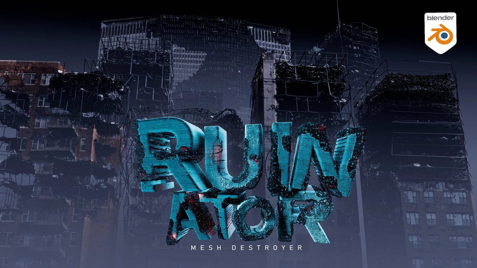 The Ruinator is a non-destructive geometry node setup that converts intact structures into partial ruins. It operates by hiding specified sections of a mesh and populating the gaps with procedural destruction elements, including damaged beams, girders, walls, floors, and debris.