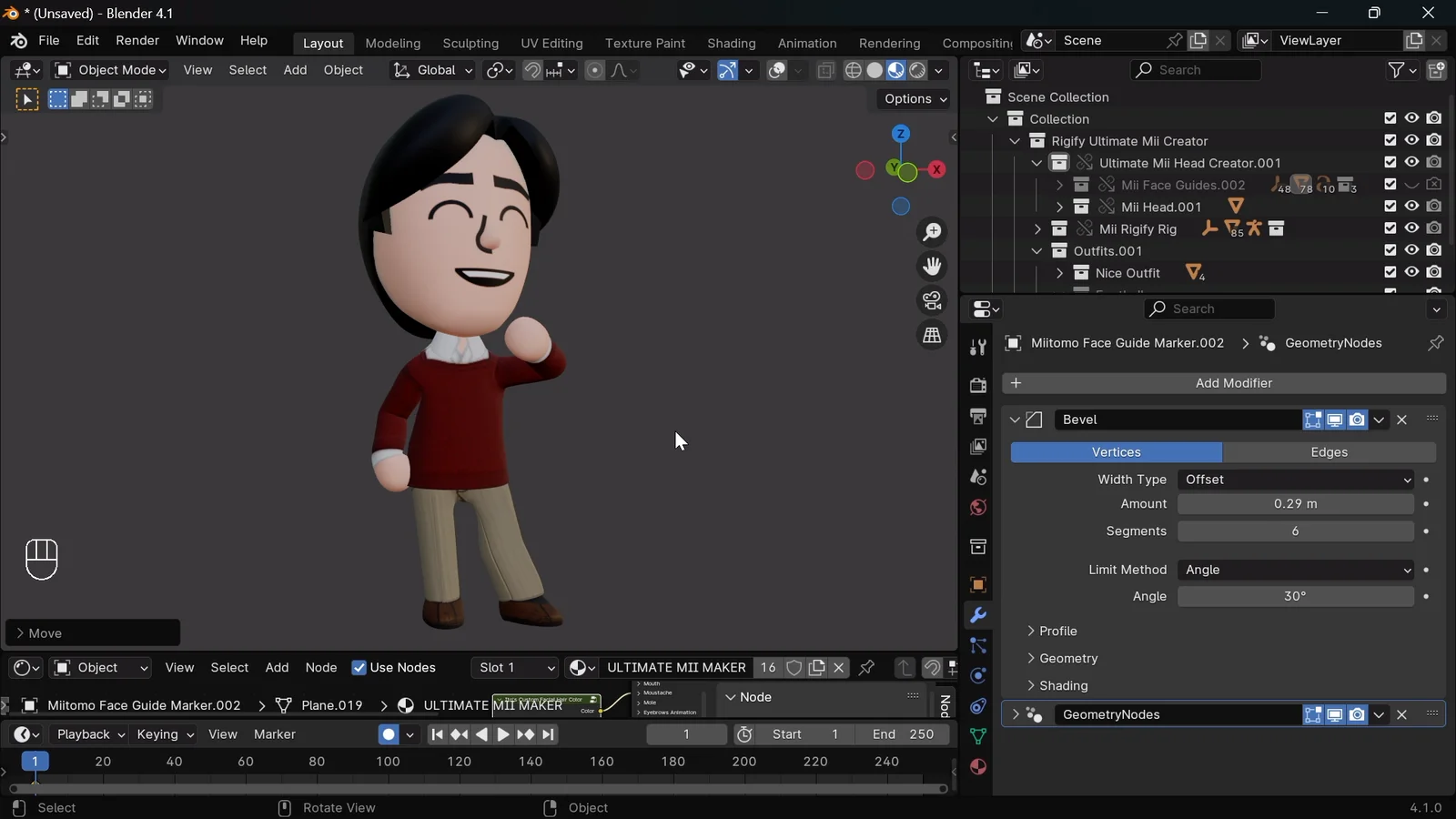 The Ultimate Blender Mii-Maker is an asset library designed for generating and customizing Mii characters directly within Blender. The setup includes an extensive collection of facial features and assets, designed to mirror the customization options seen in typical Mii creation interfaces, along with additional features inspired by Miitomo.