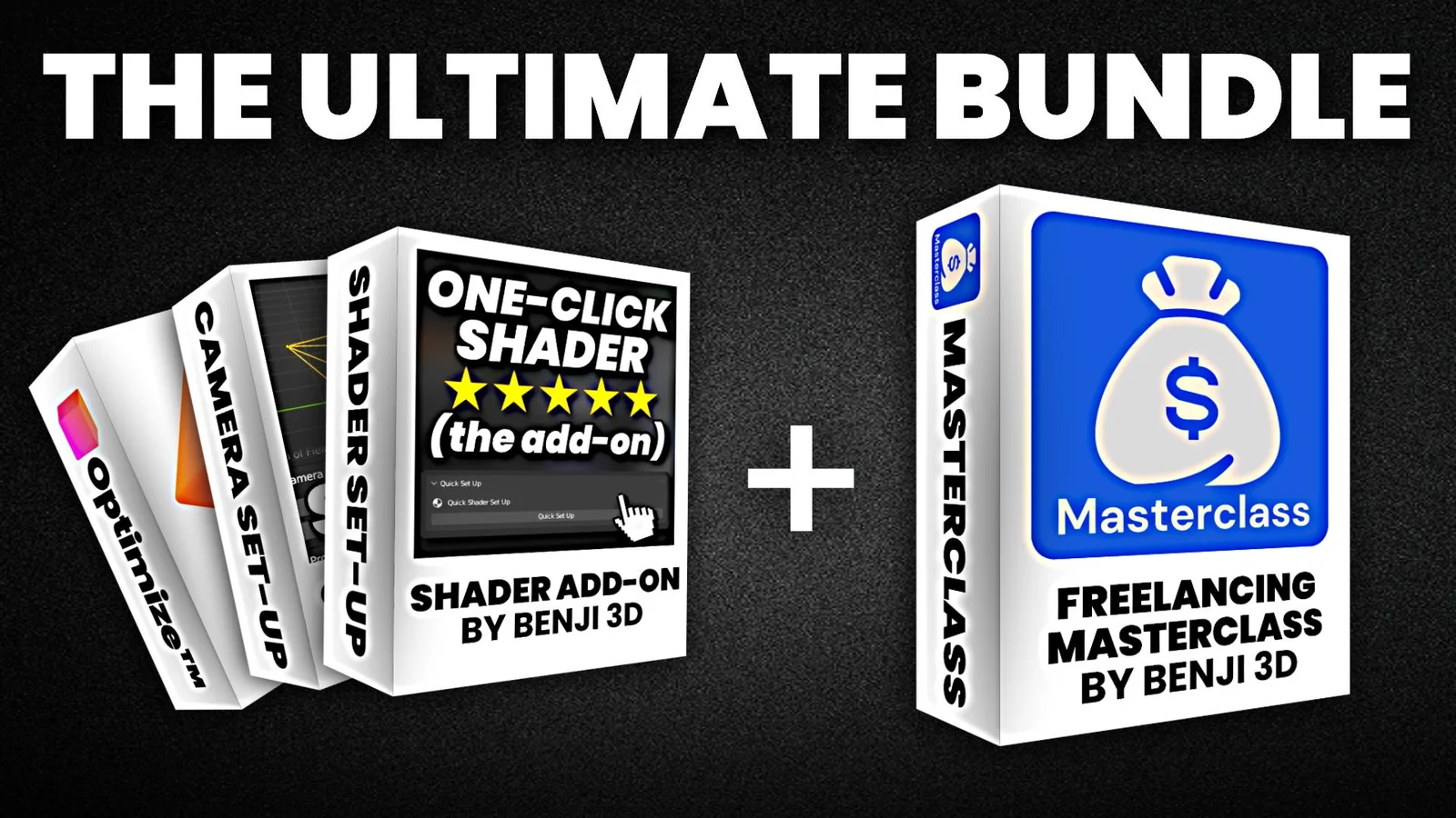 The Ultimate Bundle packages three add-ons and a training course created by Benji 3D. The included tools are the Quick Shader Set-Up Addon for material workflows, the Optimize Blender Addon for scene performance, and the Pro Camera Addon. It also contains the Blender Freelance Masterclass, which provides training on professional practices.