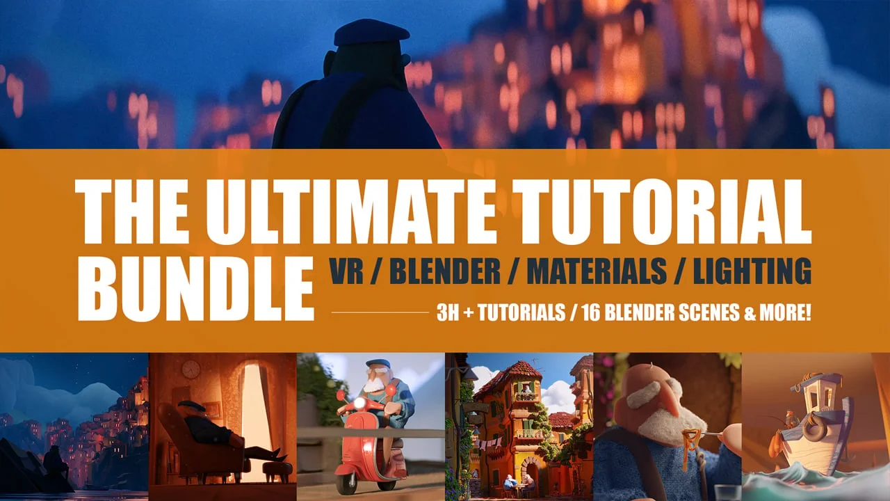 This bundle collects three distinct tutorial packs focused on stylized visual development and workflow techniques. The package includes over three hours of narrated video instruction covering a VR-to-Blender pipeline, cinematic lighting strategies, and comprehensive scene creation. Alongside the video content, the bundle provides 16 complete Blender scenes from the Lorenzo project for study and reference.