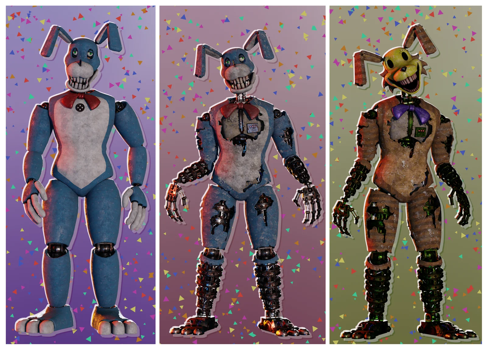 This collection features rigged and textured character models from The Walten Files series, optimized for Blender's EEVEE render engine. The pack includes an Unwithered Bon with a clean suit, a Withered Bon featuring a torn costume and detailed mesh, and a Pumpkin Rabbit variant with a unique hollow mask. Banny and Withered Banny are also included in the updated set.