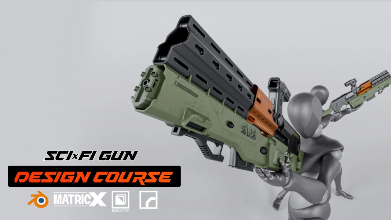 A training course focused on designing sci-fi weapons for concept art and portfolio presentations. The curriculum covers a non-destructive clean boolean workflow using the modifier stack, establishing visual hierarchy with greebles, and applying decals. It requires familiarity with Blender and the HardOps, Machin3tools, and BoxCutter addons. The course bundle includes the Matrix Material Generator tool for look-dev and a library of over 200 decals.