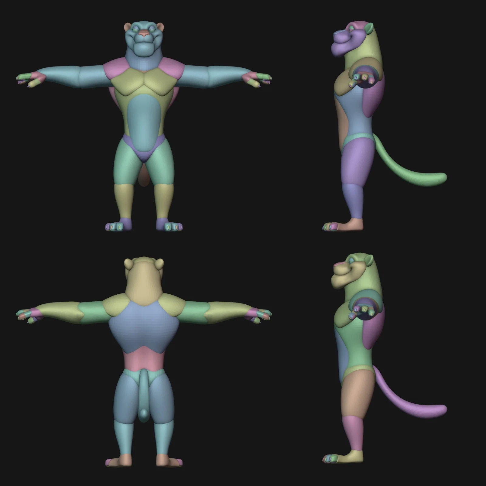 This product provides a stylized tiger character blockout designed to serve as a base mesh for 3D modeling and sculpting projects. The character is structured with separate components in the native Blender file, including the torso and head, hands, and legs. For broad compatibility with other 3D software, FBX and OBJ formats are also provided, featuring all character parts joined into a single continuous mesh.