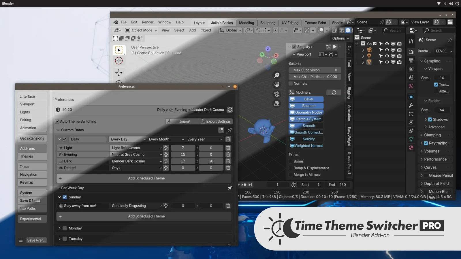 Time Theme Switcher Pro is an addon that automates Blender's interface theme changes based on user-defined schedules. It allows for theme switching depending on the time of day, specific calendar dates, or days of the week. Users can create unlimited scheduling rules, set recurring events, or configure random theme rotations at custom time intervals.