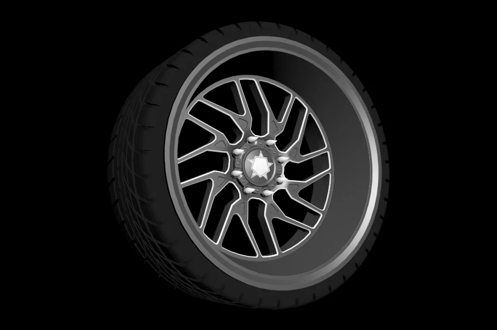 This 3D model features a black TIS 544 22x12 wheel paired with a tire. Designed as a low-poly asset, the complete assembly contains exactly 27,897 polygons and 30,353 vertices. The geometry is split between the tire, which accounts for 18,074 polygons, and the wheel itself, which uses 9,823 polygons.
