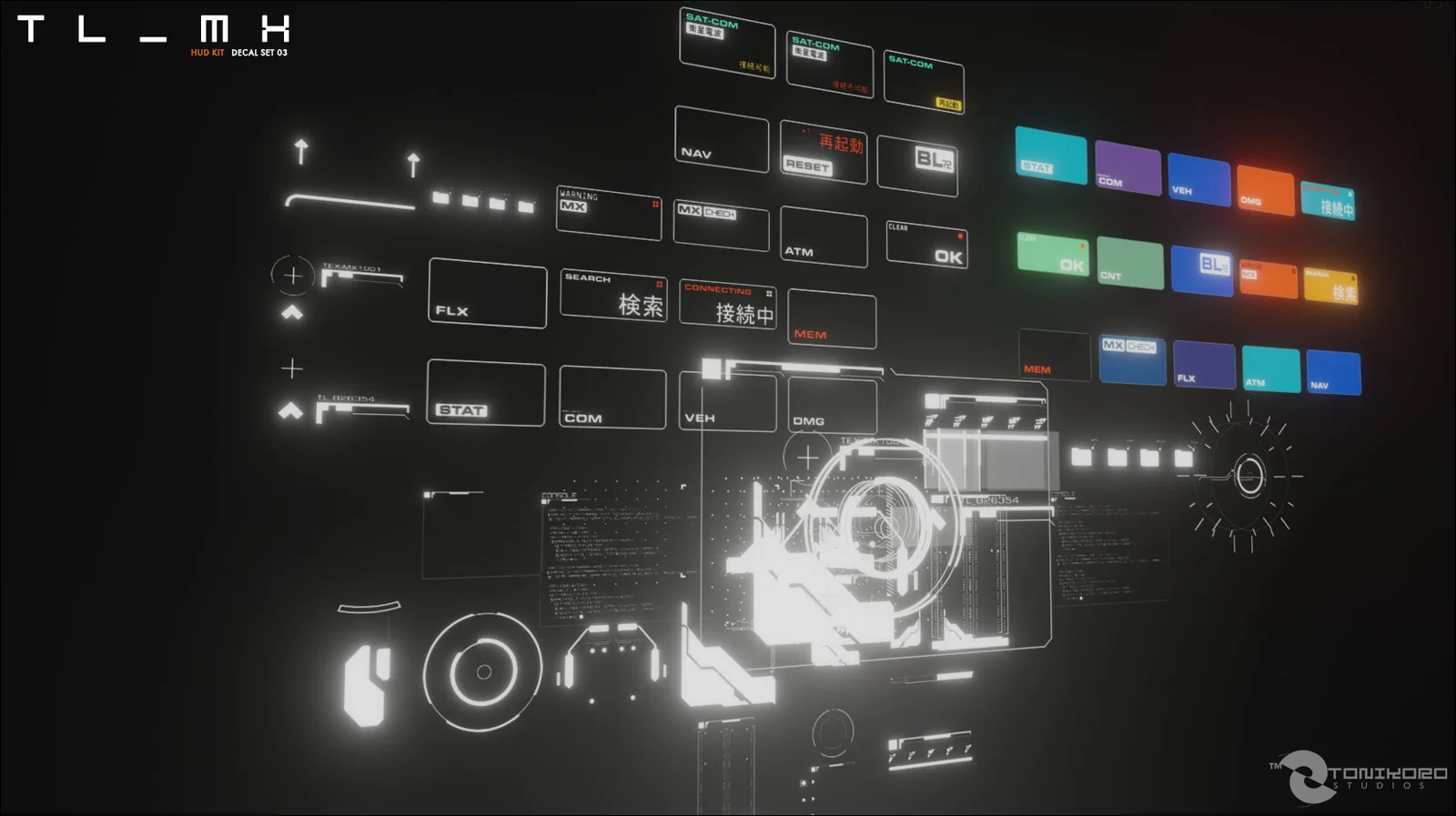 This product is a collection of 41 heads-up display (HUD) design element decals. The set includes several categories of interface components, such as data rings, sprites, frames, consoles, and transparent screens. The assets are provided as standard PNG files with alpha transparency, allowing them to be used in various decal workflows across different software. A .blend file is also included, containing all the decals pre-configured and ready to be placed on surfaces within Blender.