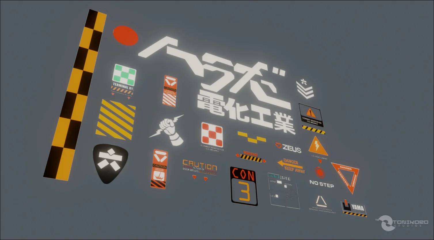 A collection of 24 handcrafted decals designed for 3D detailing and texturing workflows. The set includes various graphical elements such as warning signs, level labels, warning stripes, and Japanese designs. The decals are provided as PNG image files with alpha transparency, organized with naming conventions suited for batch processing utilities. The pack also includes a dedicated Blender file containing pre-configured decal inserts that can be directly copied and pasted onto surfaces, along with a bonus sci-fi corridor environment scene to demonstrate the assets in use.