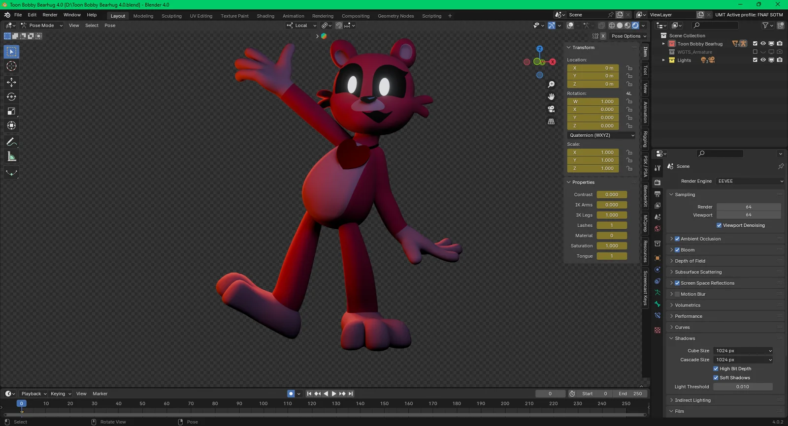 A basic rigged 3D model of the Toon Bobby Bearhug character, referenced from Poppy Playtime Chapter 3. The rig includes root drivers to control material contrast and saturation, IK settings for the arms and legs, and toggles for tongue visibility. The facial rig includes adjustable lashes and eye bones for basic expressions.