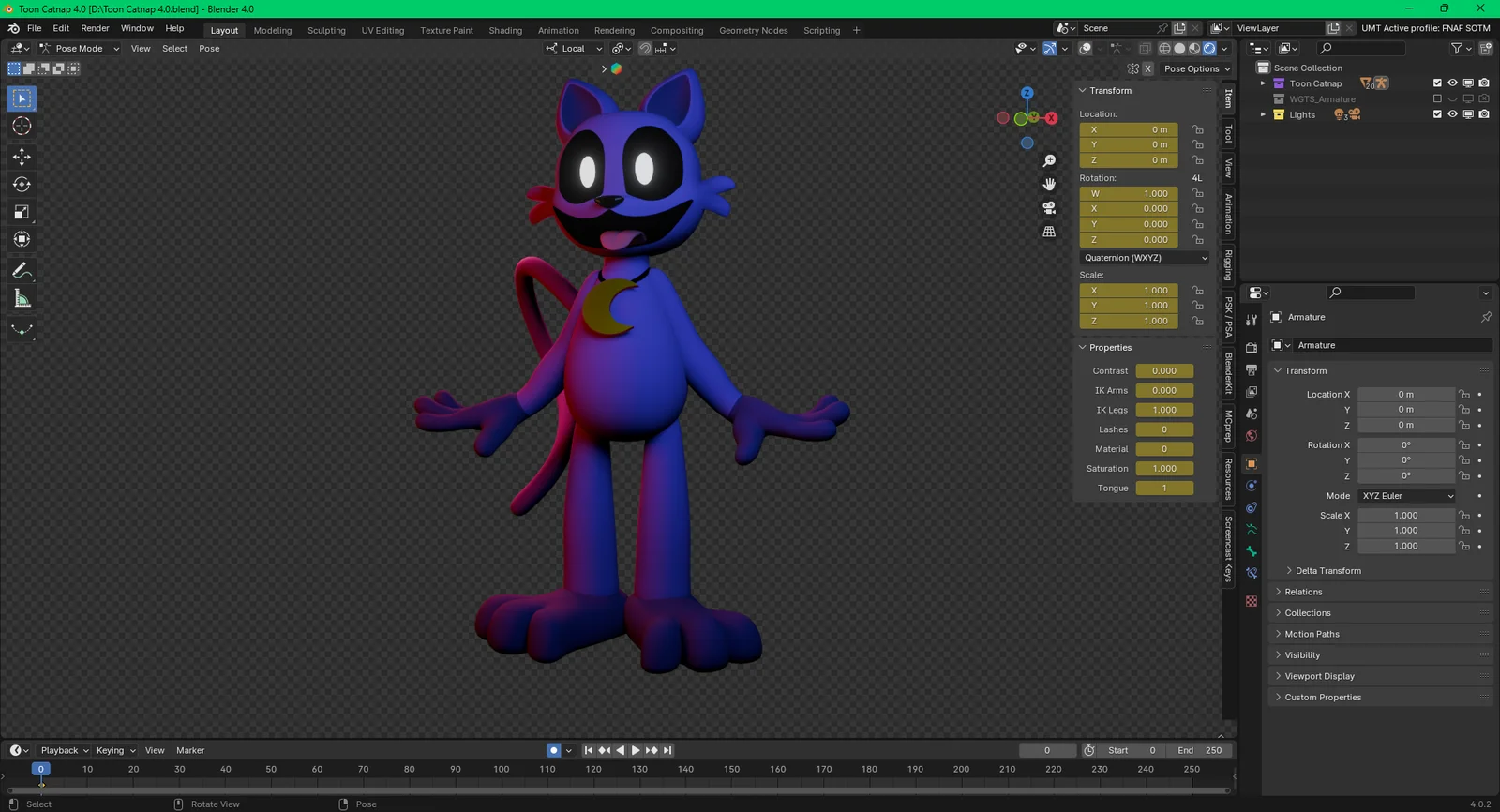 A rigged 3D character model based on Catnap from Poppy Playtime Chapter 3. The setup includes a basic rig featuring inverse kinematics (IK) for the arms and legs. Custom drivers are provided on the root bone, granting control over contrast, saturation, material settings, lash rotation, and tongue visibility.