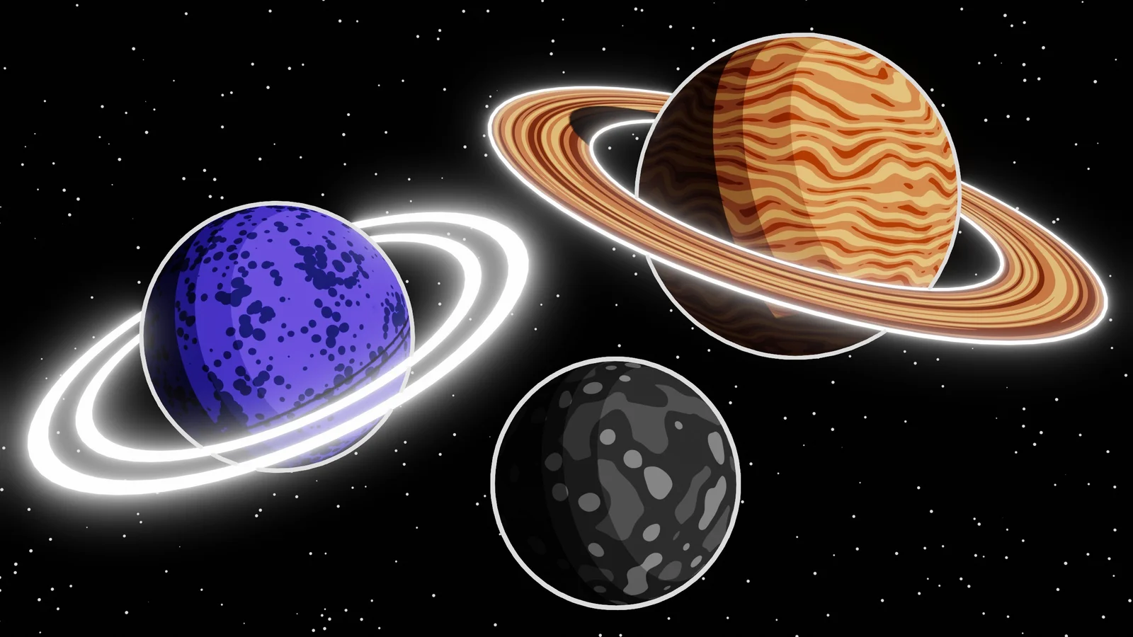 This product contains a Blender file featuring toon-style planets with procedural materials and a procedural star background. The materials are constructed using Blender's shader nodes, designed specifically for the Eevee render engine. The planet outlines are generated using Grease Pencil line art. These tutorial files provide a complete setup for studying the techniques used to create the stylized planetary scene.