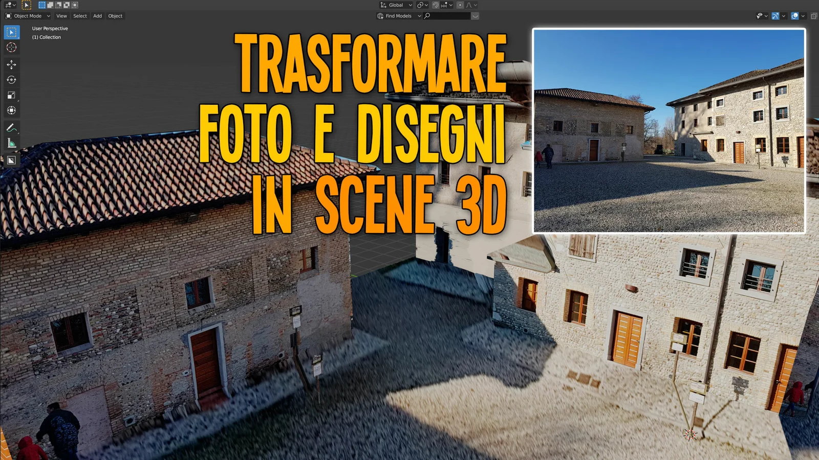This Italian-language tutorial teaches the process of transforming 2D photographs and drawings into navigable 3D scenes. Using Blender and fSpy, the course covers perspective matching, importing camera data, and building simplified 3D geometry to match the source image.