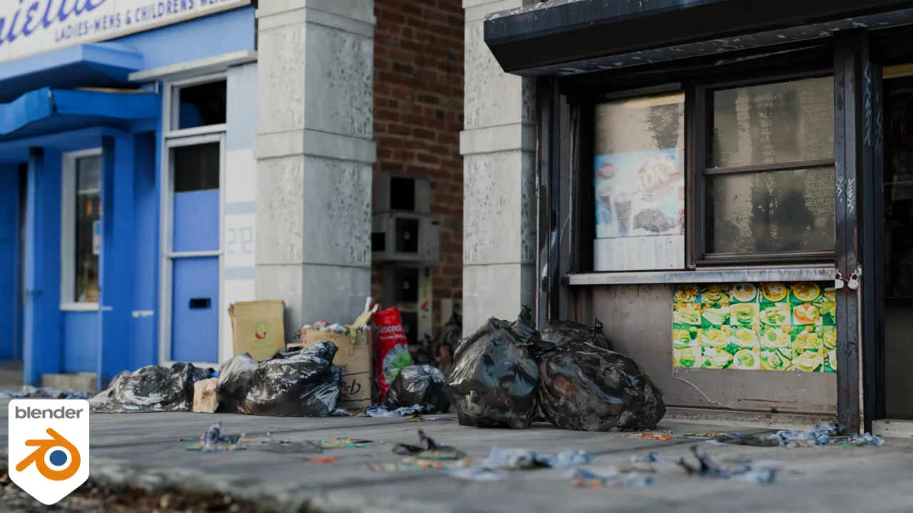 Trash Gen is a geometry node setup and asset pack designed to scatter refuse across 3D surfaces. The generator automatically aligns the scattered items to the target object and allows users to restrict spawning to specific faces. It includes controls for adjusting the overall density and selecting specific types of trash, such as paper cups, crumpled papers, chip bags, cigarettes, trash bags, leaves, rocks, and pebbles. Additionally, the tool supports custom weight painting to manually mask and dictate exactly where the trash is distributed on the mesh.
