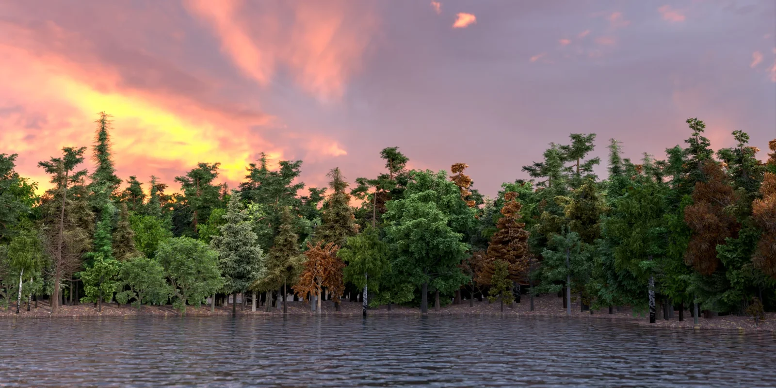 While the setup includes basic image-mapped planes for immediate use as background trees, it supports scattering any custom objects or models. Additional features include the ability to animate objects growing over the terrain, making it suitable for dynamic environment setups and optimized large-scale rendering.