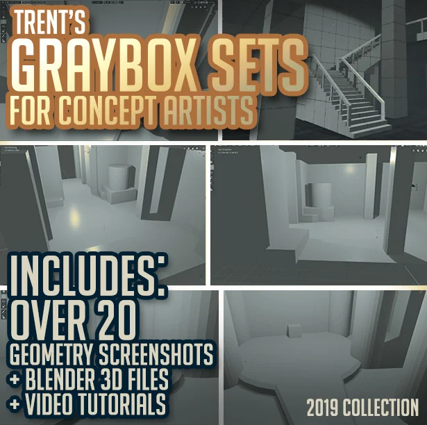 This collection provides two 3D graybox scenes designed as foundational geometry for environment concept art. The included Blender files allow artists to establish accurate perspective, basic primitive shapes, and initial lighting setups before beginning the 2D paintover process. Users can open the scenes to adjust camera angles, reposition lights, and modify the geometry by adding or moving structural elements. The package also includes a variety of pre-rendered screenshots for immediate use.