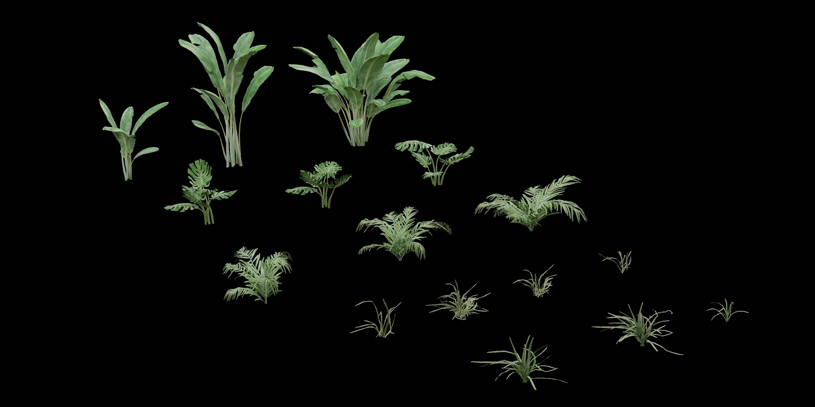 This is a collection of 3D models for creating interior decorations, forests, or landscapes. The pack includes three varieties of fern plants, three banana tree plants, three Swiss cheese plants, and seven types of grass. The materials are provided with easily adjustable textures. The models are available in the .blend format.