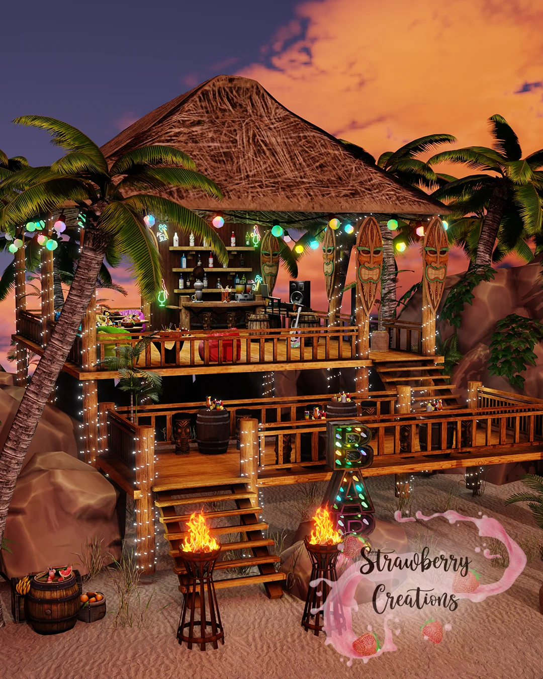 A complete tropical tiki bar 3D environment. This ready-to-render scene is configured for compatibility with both EEVEE and Cycles render engines and includes HDRI lighting setups.