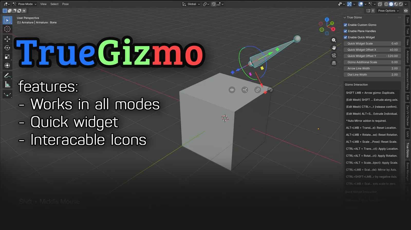 True Gizmo provides an interactive viewport widget for managing transform tools in Blender. The add-on creates a quick-access interface for changing transform orientations, pivot points, and snapping behaviors directly from the 3D viewport. It includes UI panels for its operators and maintains functionality across multiple interaction states, including Object mode, Pose mode, and various Edit modes for meshes, armatures, lattices, and curves.
