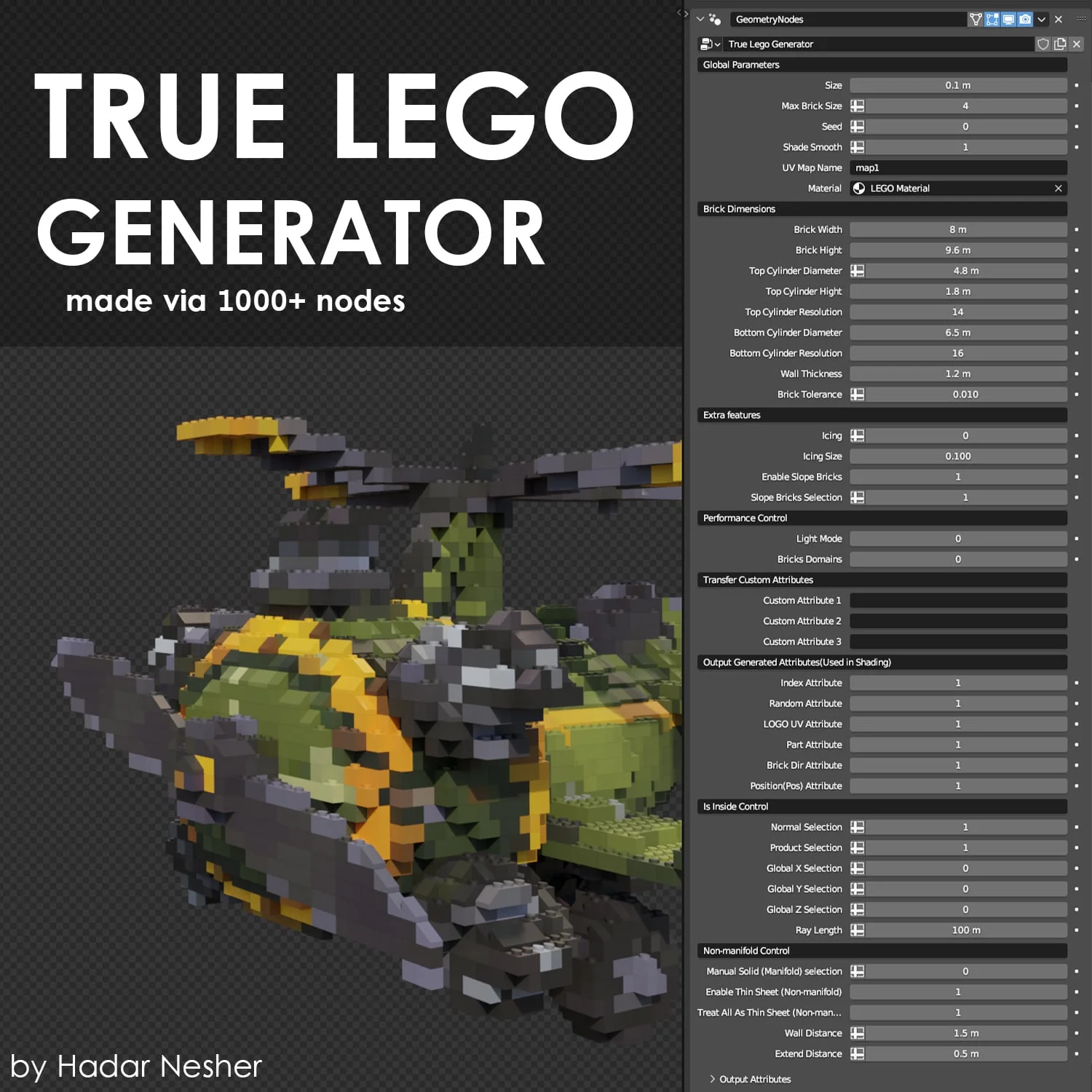 This Geometry Nodes system converts any 3D model into an accurate Lego brick mesh. It provides detailed settings for brick types, including standard, icing, slope, and thin sheet variations, while maintaining true Lego dimension ratios. The generator outputs essential data and attributes like random values, part indices, and logo UVs for shading and animation. It also transfers UV maps and custom attributes from the base model and includes a premade material with a color palette and textures.