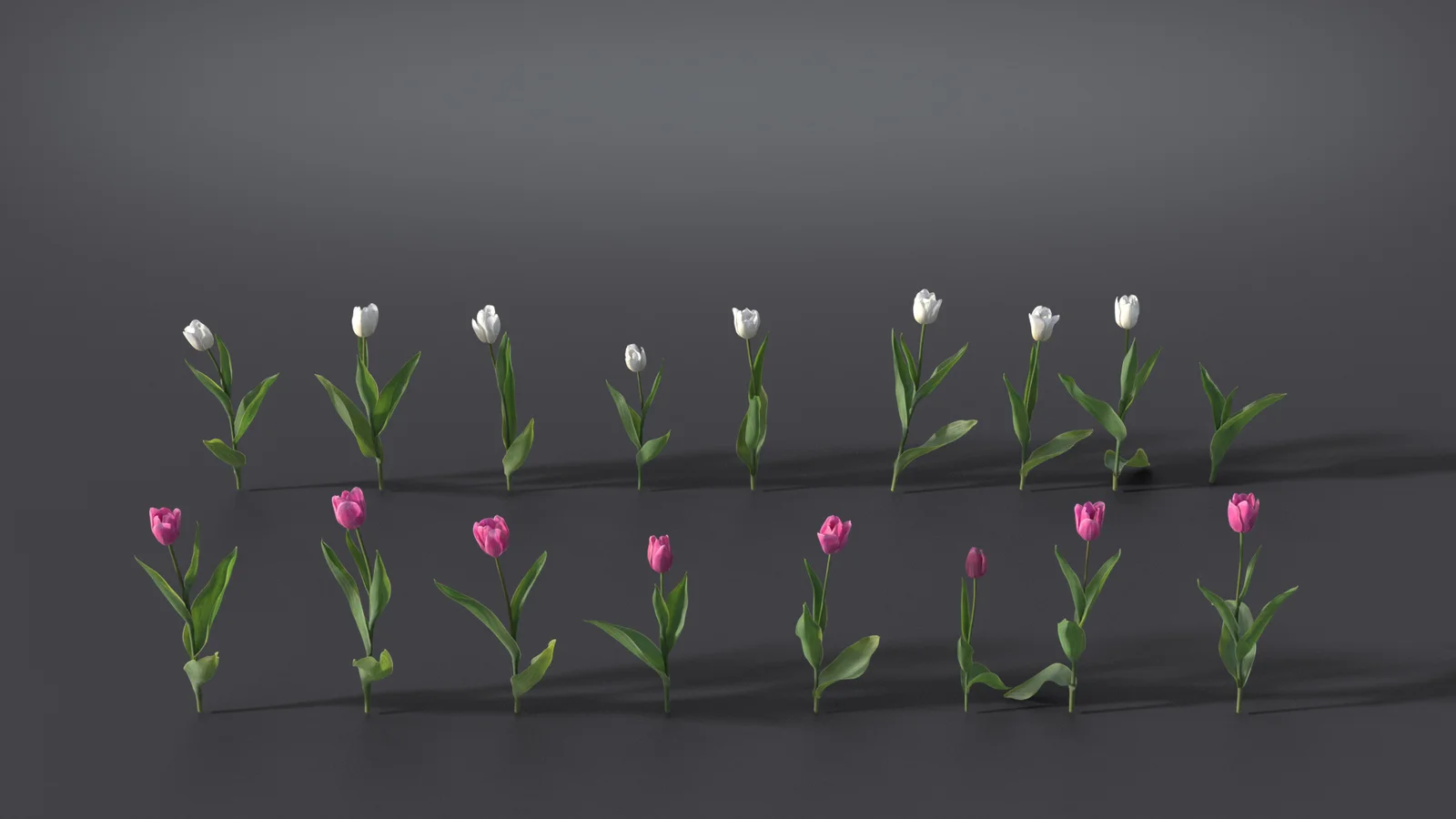 This is a collection of 36 tulip models created at real-world scale. The pack includes high, medium, and low poly variants for each tulip, totaling 108 objects. It features 12 pieces of 4K PBR maps with overlapping unwrapped UVs. The models are provided in Blender project, FBX, and OBJ formats, and contain no animations or rigging.