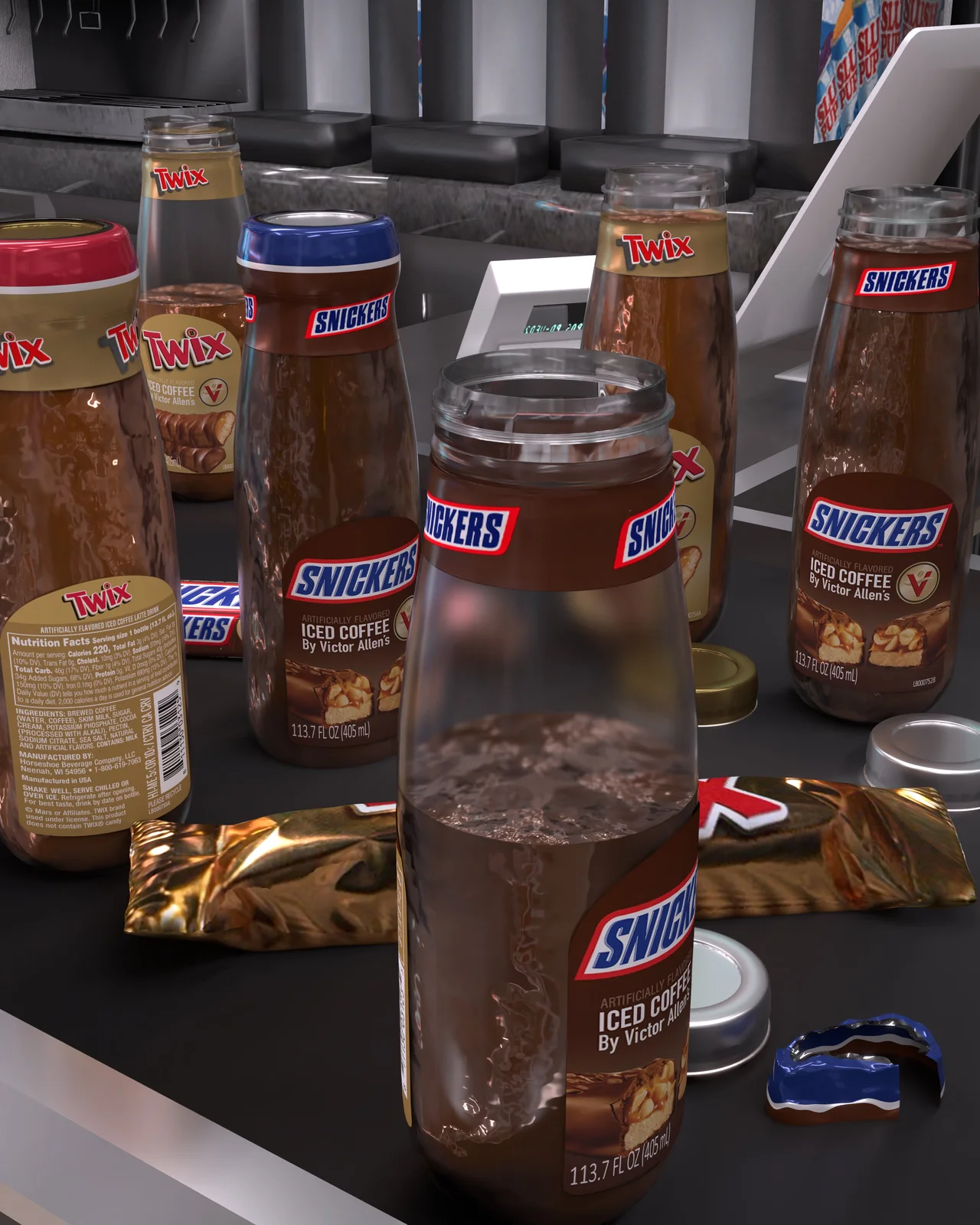 A collection of high-poly 3D models featuring Twix and Snickers themed coffee beverages. The set includes three distinct variations of the Twix coffee drink and three variations of the Snickers coffee drink, all modeled natively in Blender 4.0.