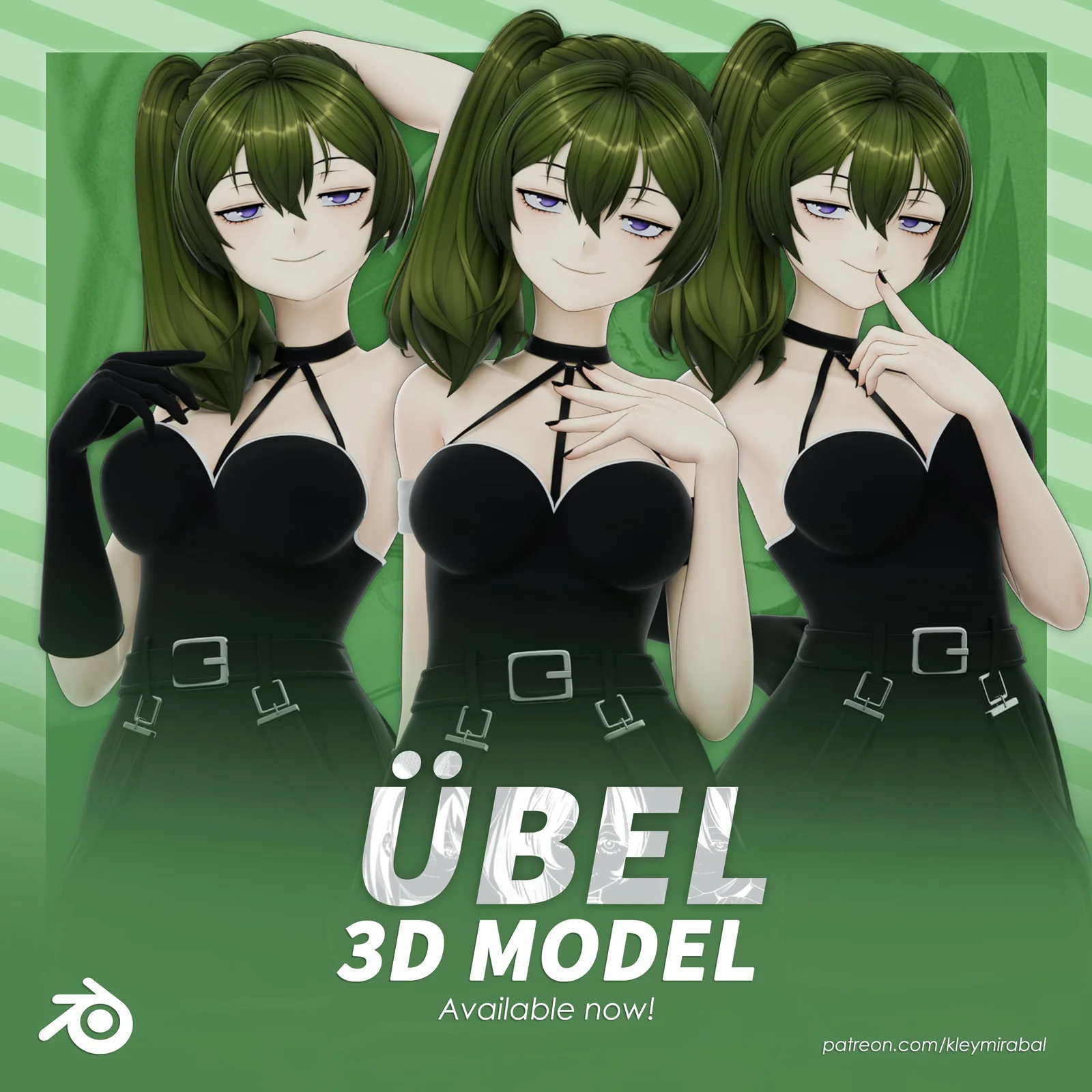 A rigged 3D character model of Übel provided in a standard T-pose. The model includes multiple outfit variations that can be toggled or controlled within the rig. The comprehensive rigging system features detailed facial controls for the eyes, blinking, mouth movements, and overall expressions. It also includes an articulated hair rig, general body controls, specific setups for the feet, and automated controls for closing the hands into fists.
