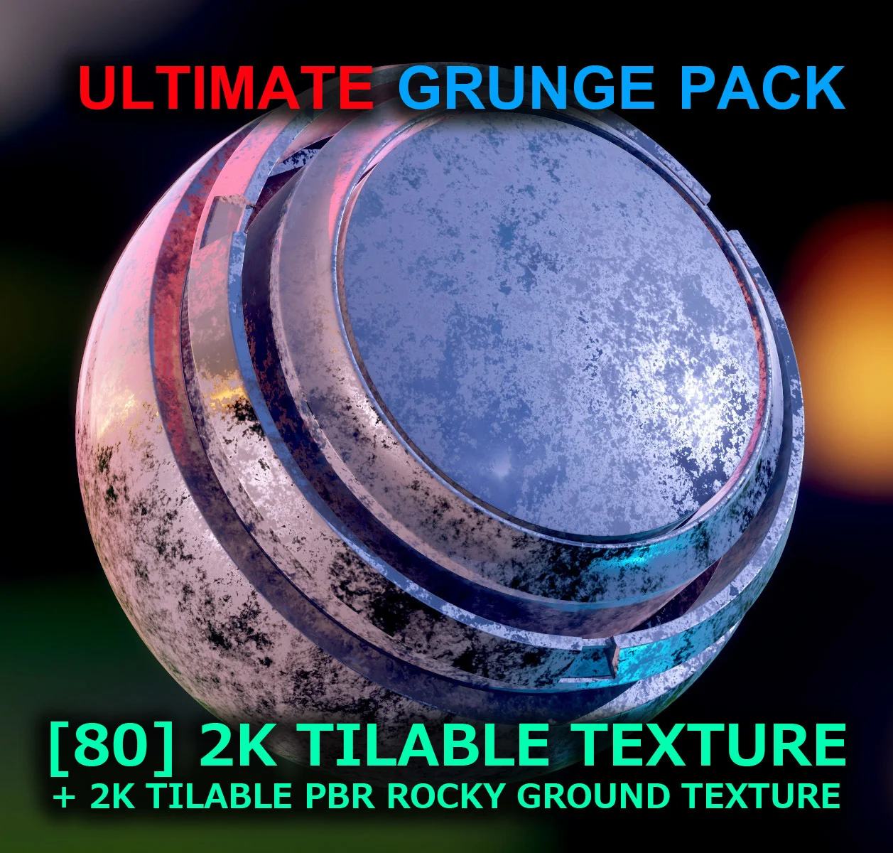 The Ultimate Grunge Pack provides 80 tileable 2K textures designed for adding detail and weathering effects to 3D surfaces. These greyscale maps can be utilized across various applications including Blender, Substance Painter, and 3D-Coat.