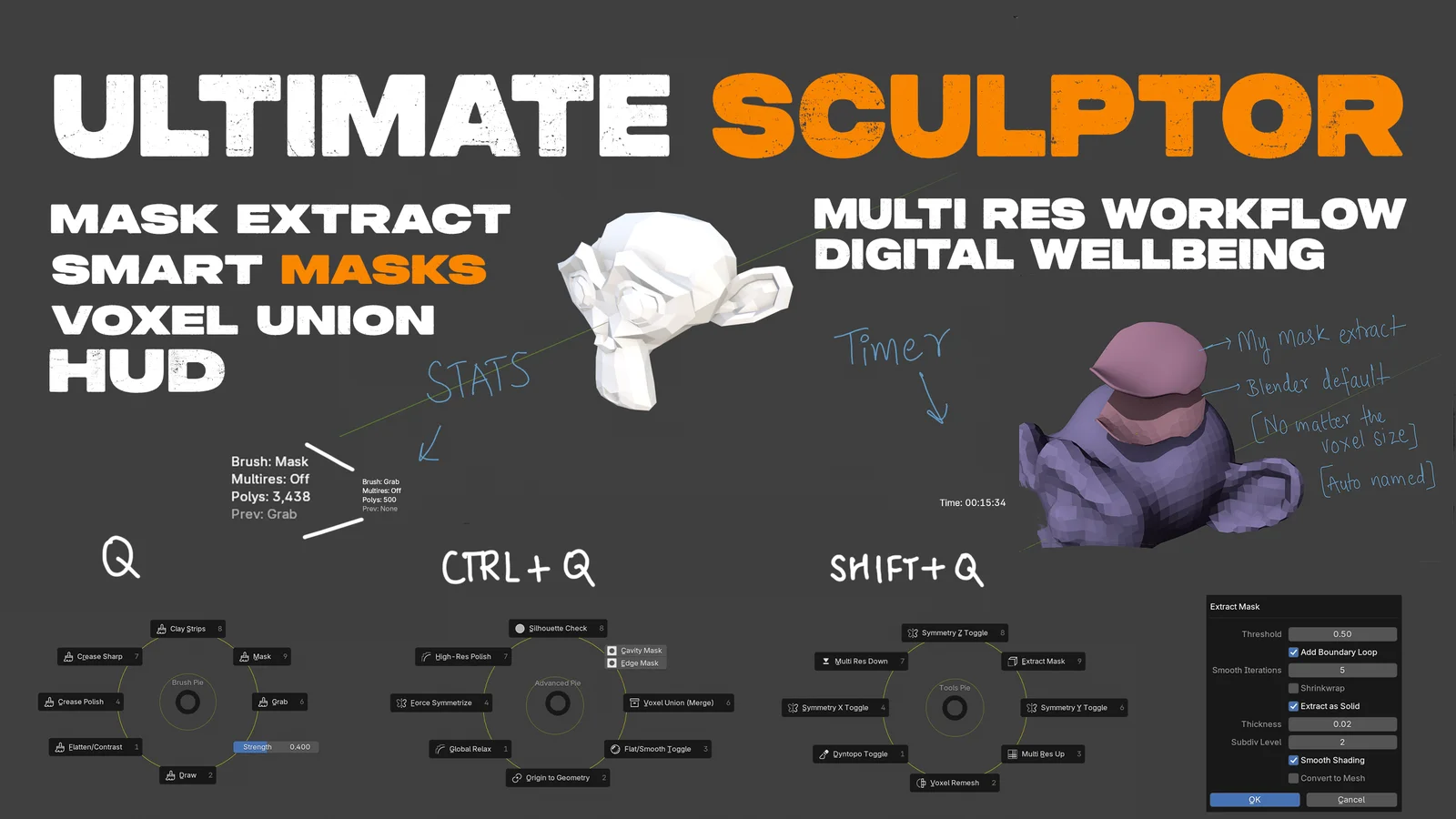 Ultimate Sculptor is a workflow add-on designed to streamline the sculpting process in Blender through custom pie menus and advanced mesh utilities. It provides quick access to tools, brushes, and operations using three customizable pie menus, alongside a persistent brush history toggle for rapidly switching between the two most recently used brushes. A built-in Heads-Up Display (HUD) relays real-time viewport statistics such as polygon count, multiresolution level, and active brush information. The toolset includes non-destructive mask extraction to generate solid meshes with thickness controls, as well as a smart masking stack featuring cavity and edge masks with modal controls for interactive adjustments. Additional mesh operations include a one-click high-resolution polish using voxel remeshing and smoothing, and a non-destructive voxel union for merging multiple objects. The add-on also integrates a wellness and time management system, featuring session timers, customizable deadline countdowns, and automated reminders for hydration, saving, and taking breaks.