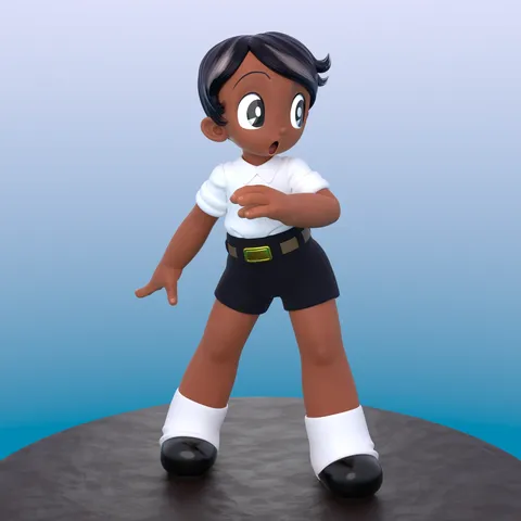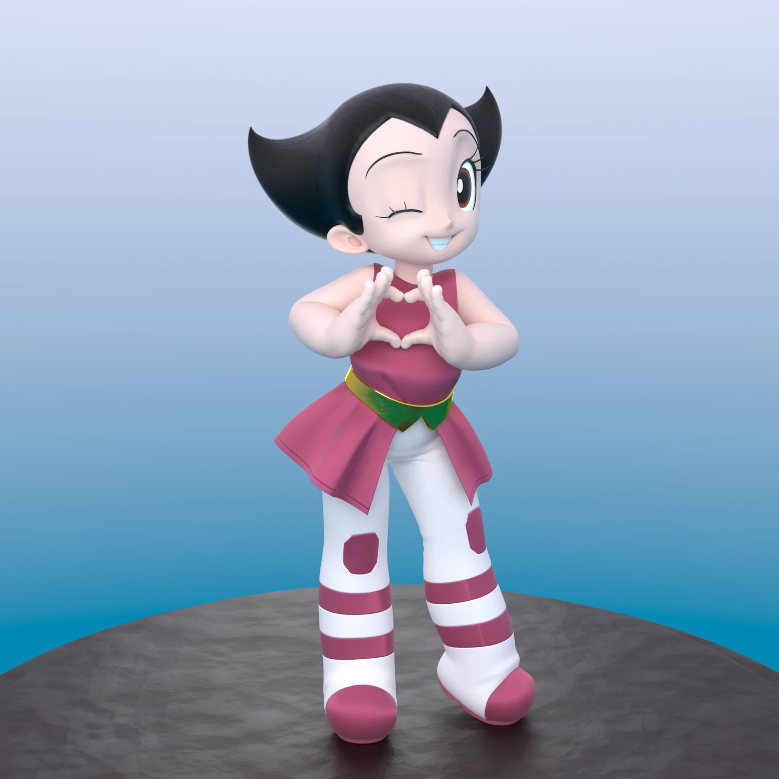 A fanmade 3D character model of Uran from the Astro Boy series. The model is equipped with an animation-ready Rigify armature and a hybrid facial rig that utilizes both shape keys and weight-painted controls. It includes an opening chest compartment with modeled internal components and employs lattice modifiers to enable squash and stretch deformation on the head. Two outfits are provided: a default look based on her 2003 design and a secondary dress. The model shares its base mesh and core rig structure with the creator's Astro Boy V2 model.