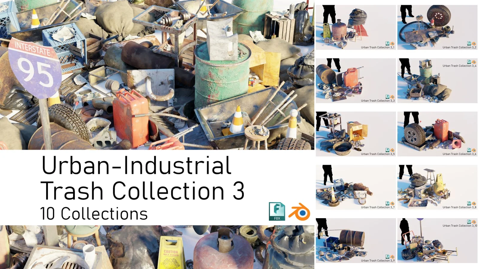 This asset pack contains ten distinct collections of urban and industrial trash, including waste, scrap, junk, and garbage. Designed with low-poly geometry that incorporates triangular polygons, the models are suited for populating background scenes or game environments. The assets come fully UV unwrapped with applied PBR materials and include texture maps ranging from 512px to 2048px. Files are provided in .blend format with textures packed, making them ready to load into Blender's Asset Browser for drag-and-drop placement. Standard .fbx files with embedded textures are also included.